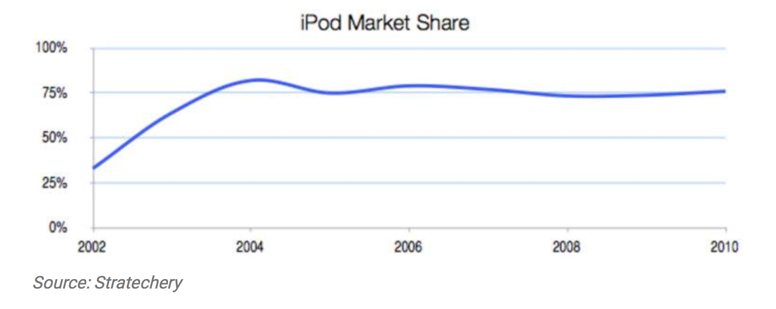 从2003年到2010年,iPod 占据了75% 的市场份额,这在消费电子产品领域是一个不可思议的成就。