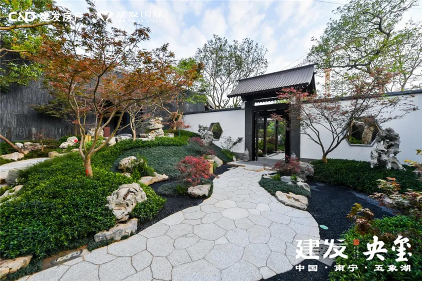 整体示范区布局以山水为灵魂融汇名园胜景与造园手法浓缩叠石、理水、照壁、林木等新中式古典园林景观精萃既充满了古朴之美,又暗藏天地情怀儒门礼制的三进归家仪序,俯拾皆是的东方意趣更令现场来宾们沉醉于满园春色中流连忘返叹为观止