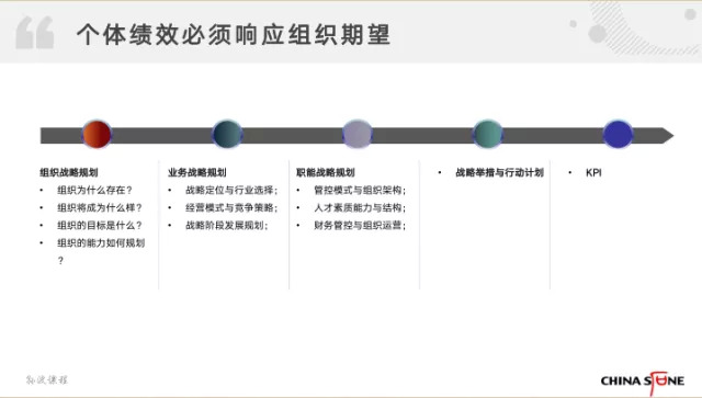 绩效管理是战略落地的工具,从这个角度去看个体绩效,那么个体绩效必须响应组织的期望。首先,组织有自身的使命、愿景等顶层事业理论和战略规划。然后把顶层的战略规划转换成业务、产品经营模式,这叫做业务战略规划。下一步,在具体的职能层面,管控模式、组织架构、人力资源管理、财务管控、生产运营如何支撑业务就构成了职能战略。再往下,规划每一部分职能当期的举措或者行动计划,而再根据计划指标进行评价、考核。从这个逻辑链可以看到,个体绩效来源于组织战略的成功落地分解。所以,绩效管理的过程其实就是战略执行的过程。绩效管理也是分阶段的。很多企业存在战略不清晰的问题,这种情况下的绩效管理,更多的是从职能出发。这种对岗位履职情况的考核,虽然也叫做绩效管理,但是显然不能称之为战略性的绩效管理。