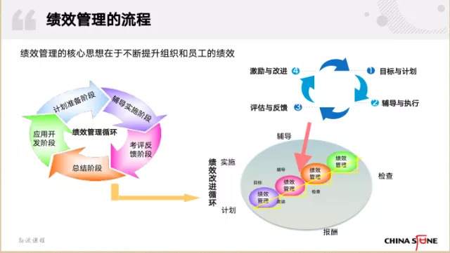 第三,绩效管理不仅强调工作结果,而且重视达成目标的过程。绩效管理是一个循环过程。在这个过程中,它不仅强调达成绩效结果,更通过目标、辅导、评价、反馈,重视达成结果的动态化循环过程。