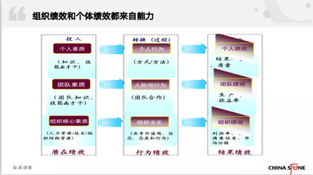 无论组织绩效和个体绩效,其实都是来自于能力。无论个体绩效、还是团队绩效、还是组织绩效,都来自于投入转换的过程。但是具体构成有差异,比如个体绩效来自于个人的知识、技能、才干等等,个人素质作为投入,通过个人的被激励的状态、个人做事的方式和方法,带来个体的绩效和产出。而团队的投入来自于团队中个体所形成的有机的最优结构。在最优结构之下,团队内部不同的角色行为方式的合理性,产生团队的绩效。组织绩效 来自于组织的投入,包括组织的硬件、软件、人员、管理、氛围,甚至企业家精神、历史、文化、氛围等等,我们称之为组织的核心素质。组织的核心素质,通过一体化的行为方式,或者组织文化之下大家共享的价值观所带来的行为模式,带来组织的绩效。