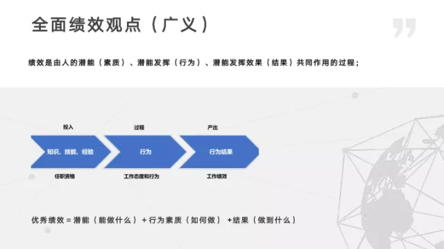 有了这些概念之后,我们要建立一个“全面绩效管理”的概念。如果依然从系统的角度去看,包括了投入、过程和产出的全过程;从维度上看,也可以更加细分。但这里有一个很重要的问题——很多人把“全面绩效”的概念理解成了全面绩效指标。这是由于过去计划经济的惯性,我们非常关注任务绩效,对周边绩效关注不够。所以认为管理投入、过程、产出全过程就是把潜能类、行为类、结果类指标都纳入到绩效指标里去,从而构建出一个非常庞大的绩效指标体系,这是个错误的认识。