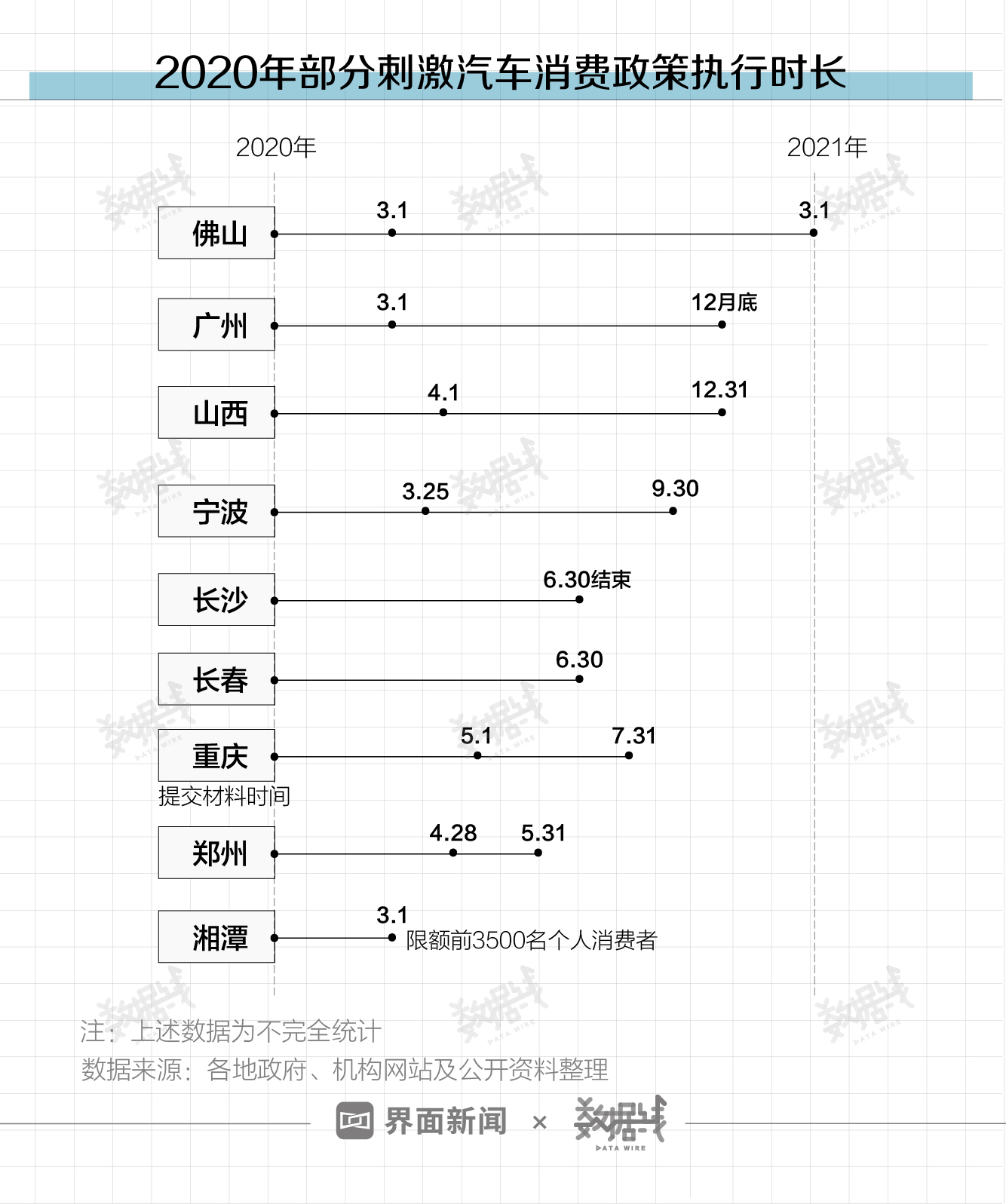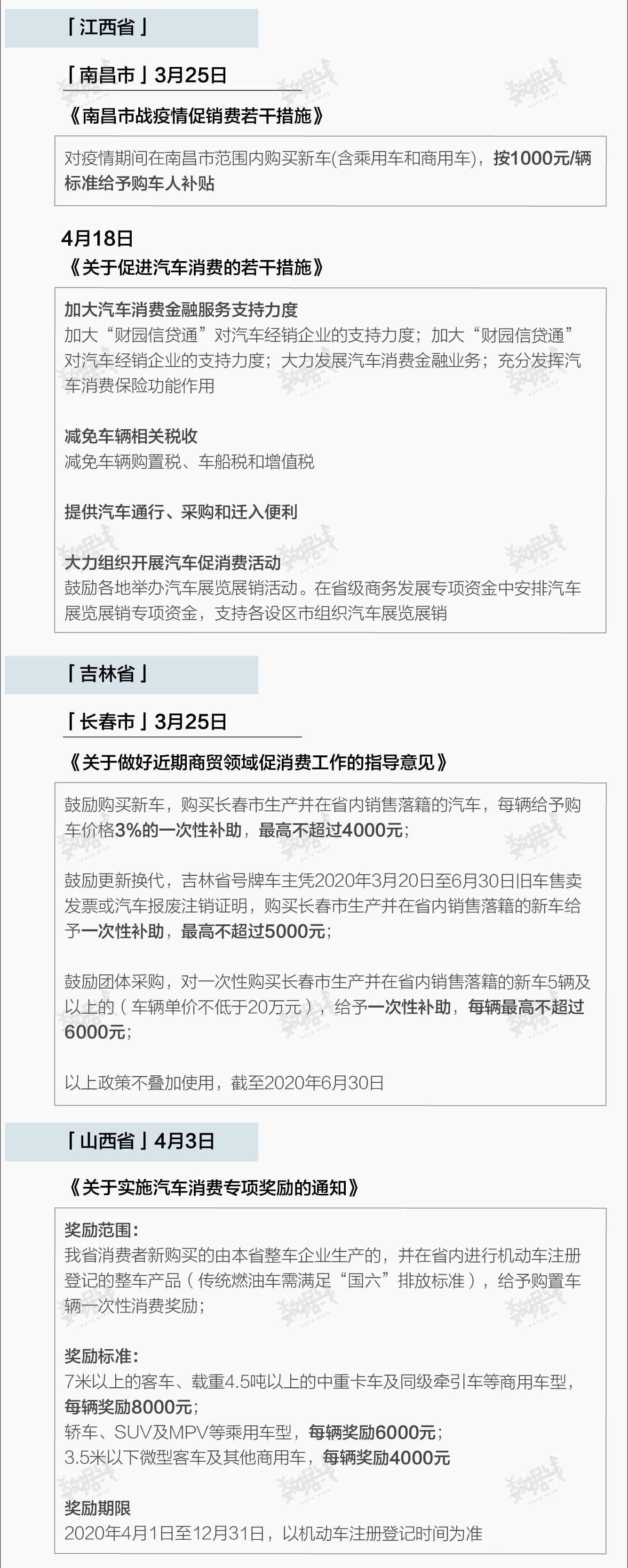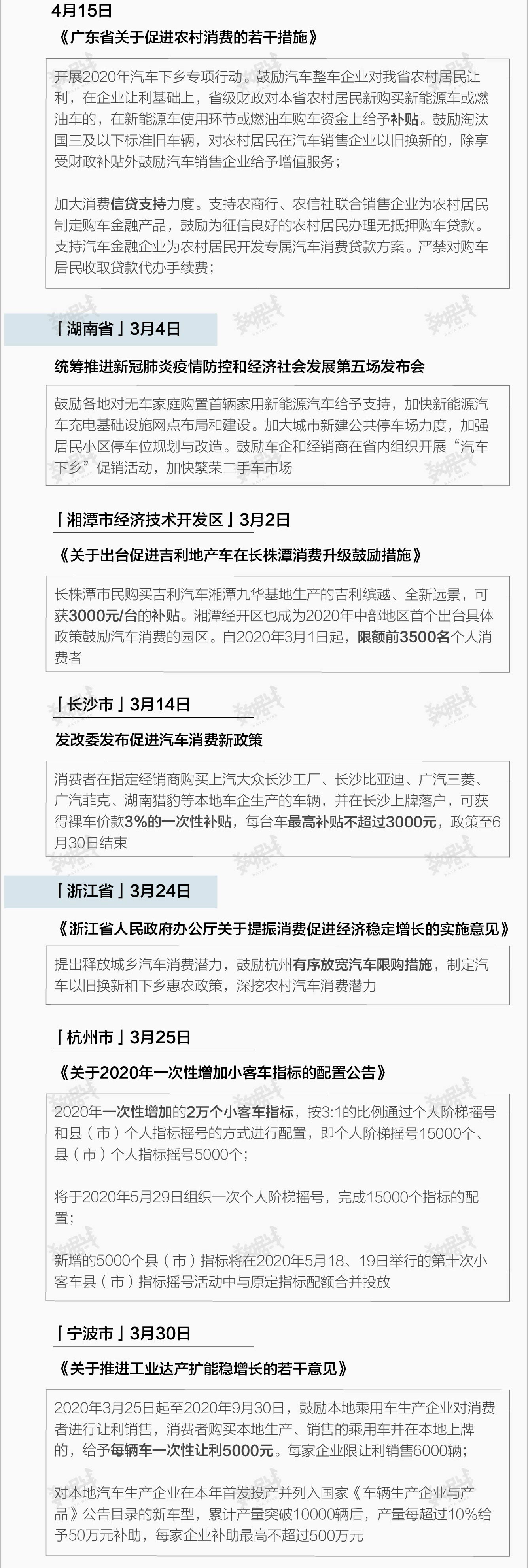 政策会持续多久?最短一个月最长一年。从明确公布截至日期的9地政策来看,除湘潭市经济技术开发区政策明确自2020年3月1日起,限额前3500名个人消费者外,其余8项政策“补贴周期”在1个月至1年不等,且多数补贴政策会在今年年底结束。