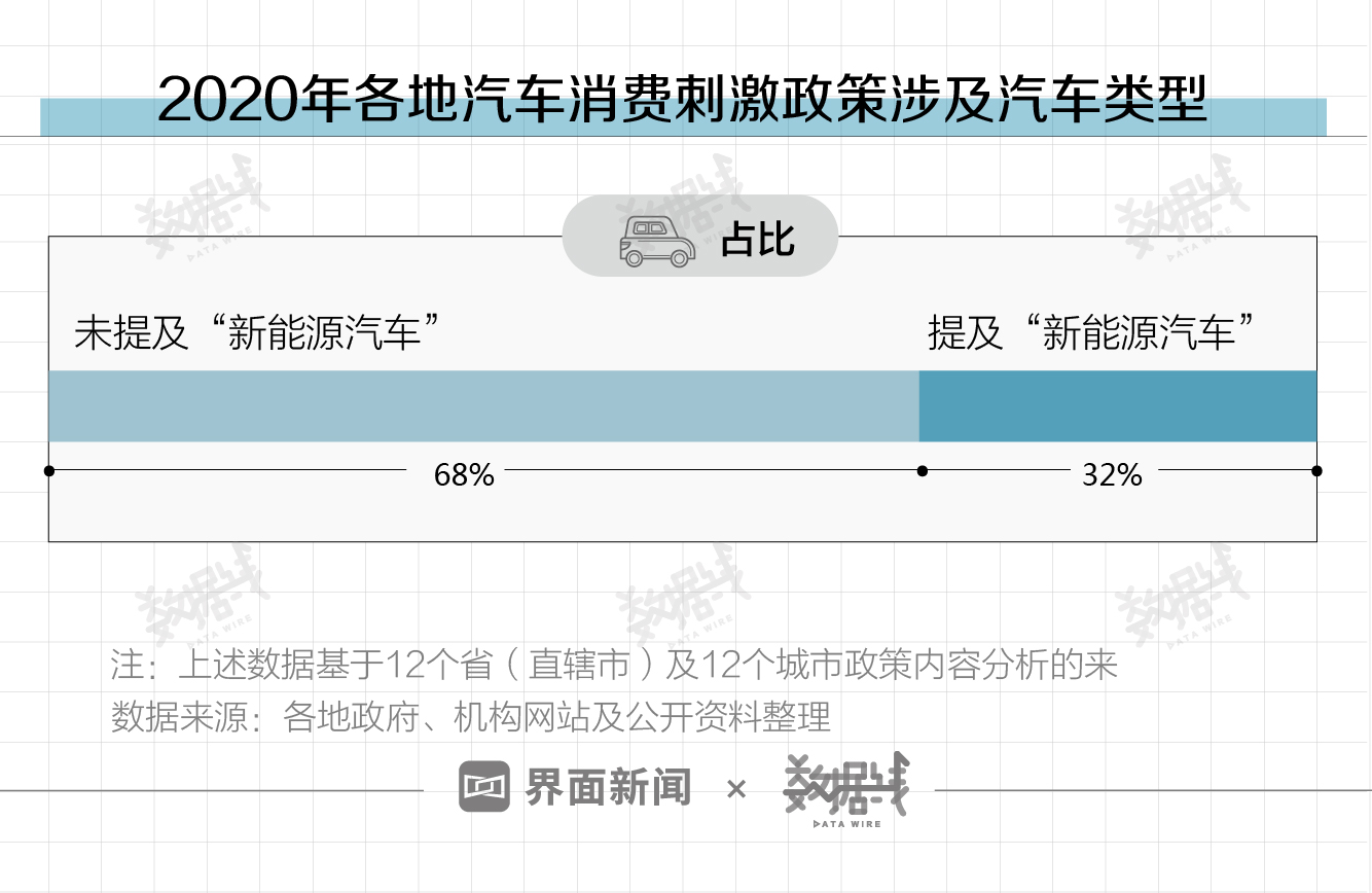 据界面数据统计分析,本次刺激政策更倾向于传统汽车,在上述政策中,明确提及新能源汽车的政策占比为32%。