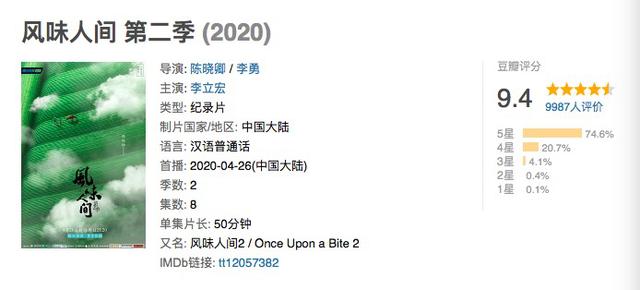 4月27日,总制片张平接受一点剧读采访时,《风味人间2》豆瓣刚刚开分,9.5分的高分让她坦言“还是蛮感动的,感谢大家的厚爱”,不过在制作上他们始终信奉“竭尽全力做好自己该做的”。截至写稿时,豆瓣评分人数近万,四星及以上好评超过95%,知乎上亦有92%知友进行推荐,认可度可见一斑。