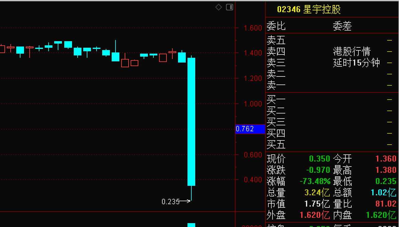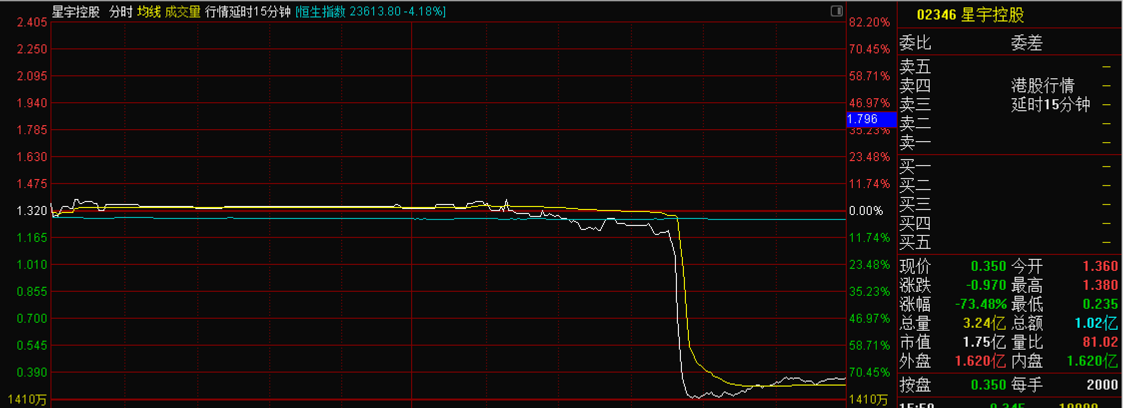当天,星宇控股以1.36港元开盘,却报收于0.35港元,当天的换手率64.79%,成交额1.02亿港元,跌幅和成交额均创了记录。