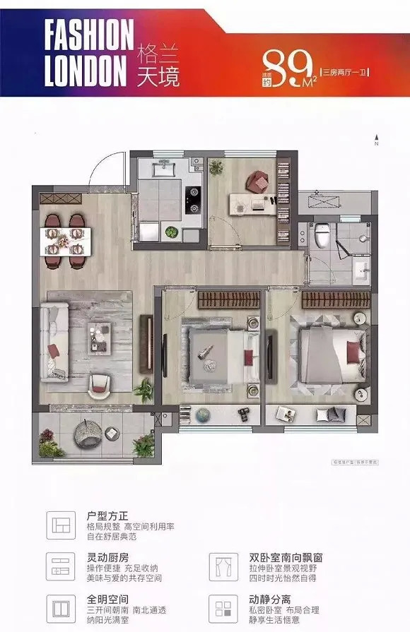 建筑面积约89㎡灵动三房,客厅、双卧室三开间朝南,阳光满室;厨房动线流畅;餐厅、客厅、阳台连伸视野,高效布局,丰盈生活乐趣。