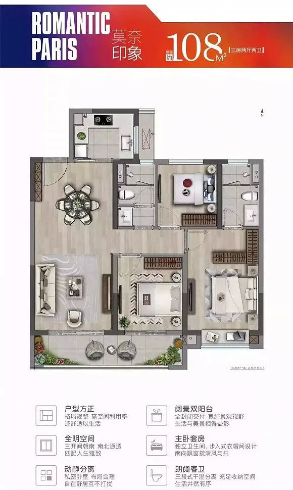 建筑面积约108㎡阳光三房,三开间朝南,南北通透;阔景双阳台,全封闭交付,宽绰景观视野;三段式干湿分离,充足收纳空间,生活井然有序。