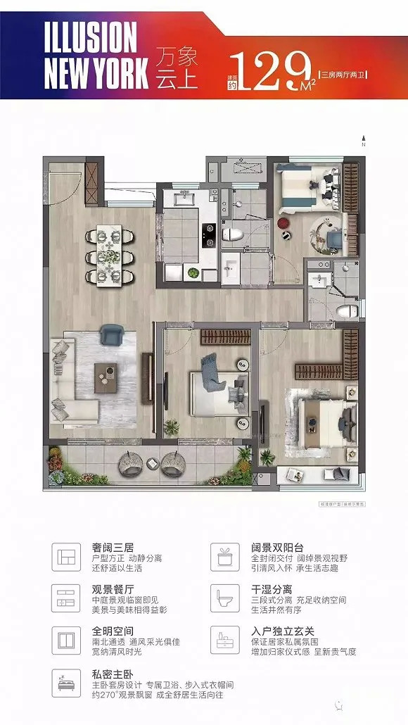 建筑面积约129㎡奢阔三居,阔景双阳台,家政和诗意的双重满足;主卧270°飘窗;独特观景餐厅设计,园林景观推窗即见。