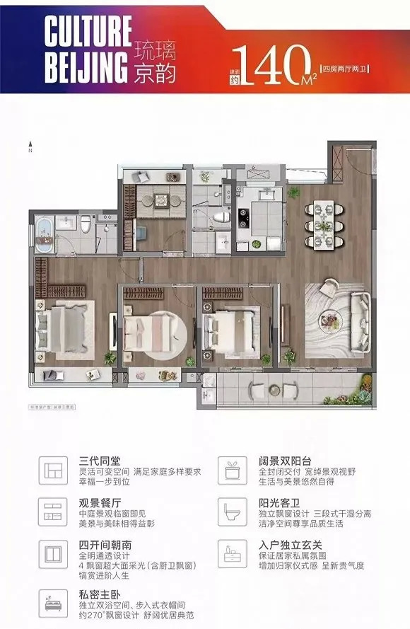 建筑面积约140㎡舒阔四房,13.9m南向开间,通风采光俱佳;客餐通厅且与阳台相连,空间游刃有余;U型厨房操作便捷,充足收纳。