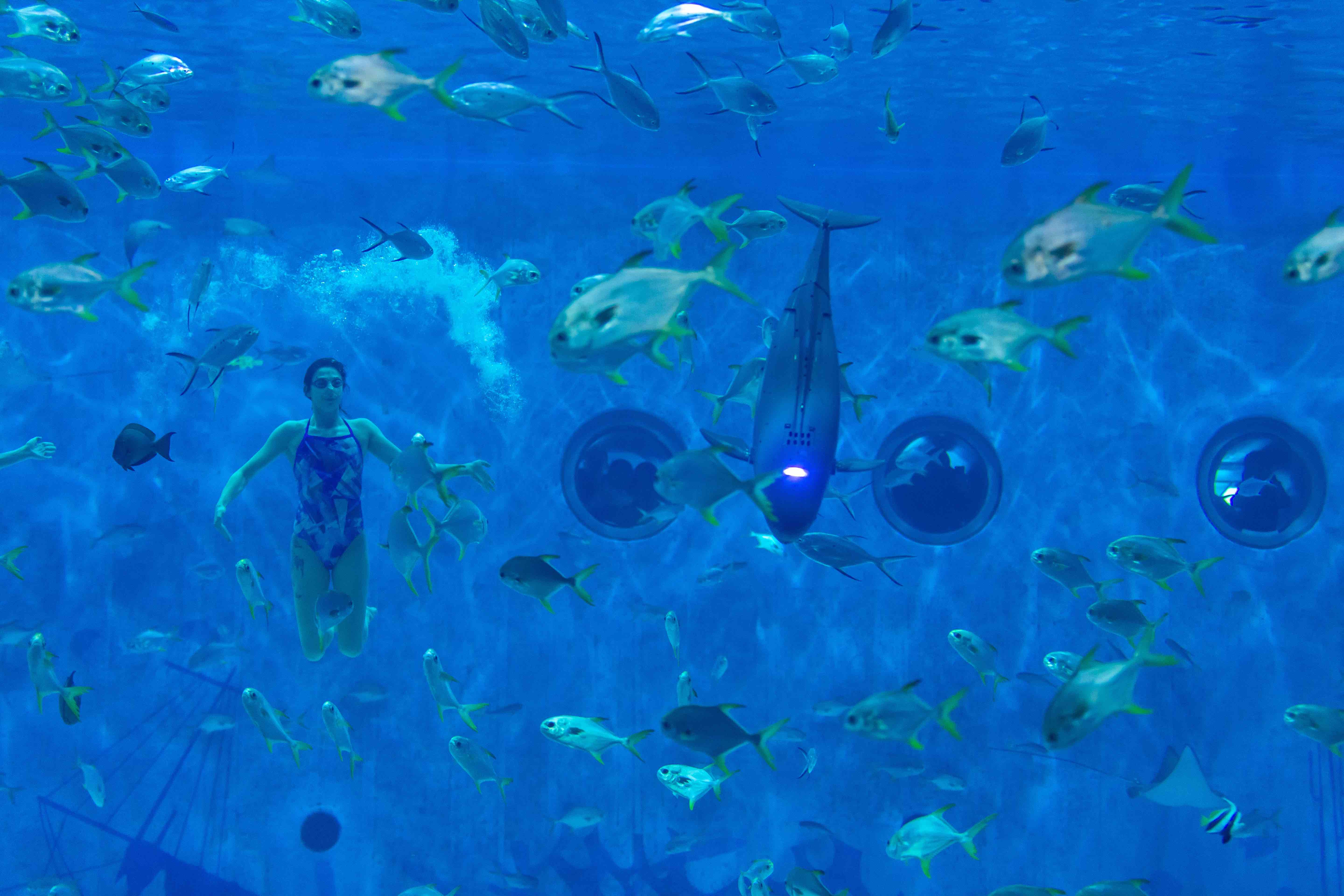 上海海昌海洋公园在疫情期间推出了“江豚机器人科普秀”的直播展示。江豚机器人以中国特有珍稀物种长江江豚为仿生原型,融合流体力学、仿生运动学、人工智能、3D打印、传感及驱动等多学科知识设计而成。这也是海洋馆对未来科技的一种尝试。