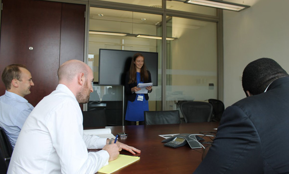 当天晚些时候,Sophie被要求在满屋分析师和其他实习生面前就欧洲股市做一个10到15分钟的演讲,这也是分析师与客户打交道时要做的。其间,分析师还会提出各种问题,整个过程友善但也很严格,为得就是让实习生们能够更加胜任之后的实际工作。