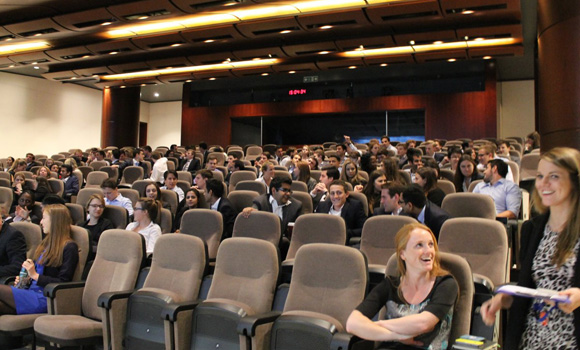 在一天结束时,在伦敦办事处大厦的礼堂里,一位公司最高层成员将给全体实习生做演讲。