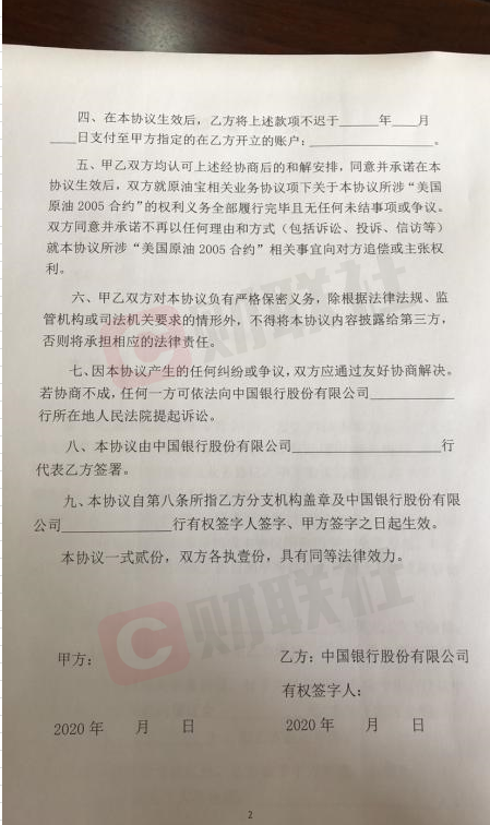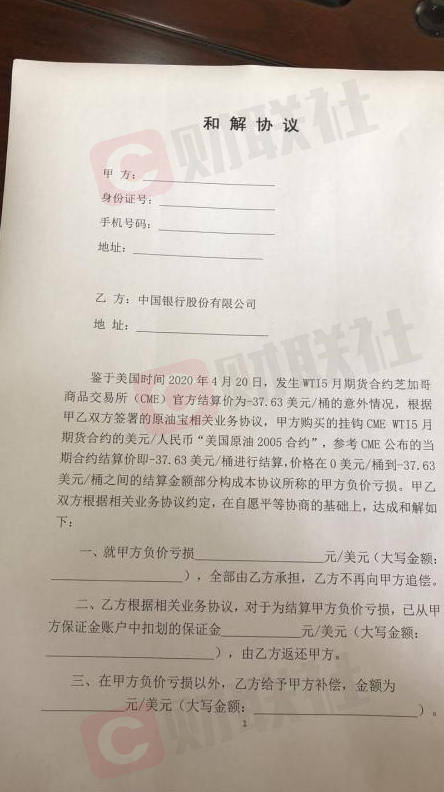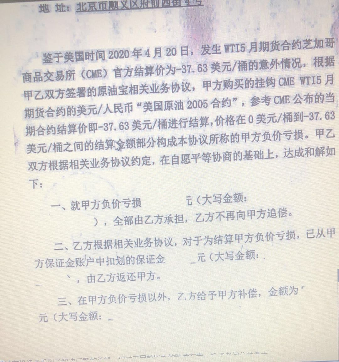 此外,一张疑似和解协议的截图也于当日流出。根据该和解协议,甲方(也就是投资人)购买的挂钩CME WTI 5月期货合约的美元/人民币“美国原油2005合约”,参考CME公布的当期合约结算价即-37.63美元/桶进行结算,价格在0美元/桶到-37.63美元/桶之间的结算金额部分构成本协议所称的甲方负价亏损。投资者因负油价意外情况产生的负价亏损将全部由中国银行承担、银行将不再追偿,因负价亏损划扣的保证金中行将进行退还。除了承担负价亏损外,中行还将对受损客户进行补偿。