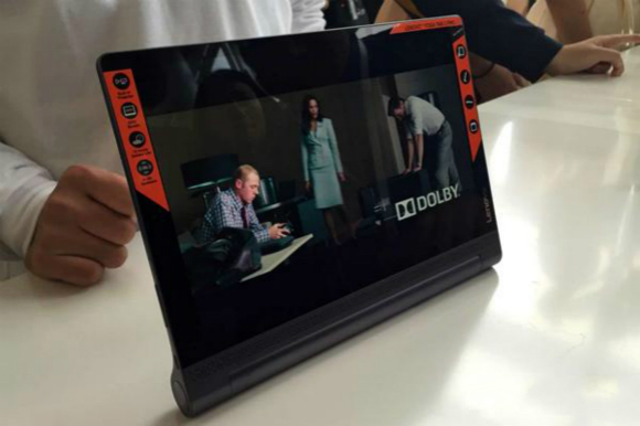 与上一代支持投影功能的YOGA Tab 3 Pro相比,YOGA Tab 3 Pro将上一代投影组建隐藏在转轴侧面改成了转轴正面,使得投影可以随转轴180度旋转,最大投影面积达70英寸。硬件配置方面,YOGA Tab 3 Pro还新搭载了4个JBL正出音扬声器,算是业界首款实现杜比全景声外放音效的平板电脑。此外,它还支持任意笔(Anypen)技术,据说无论用户使用刀叉还是胡萝卜,只要是可导电的物品,都可以进行触控操作。