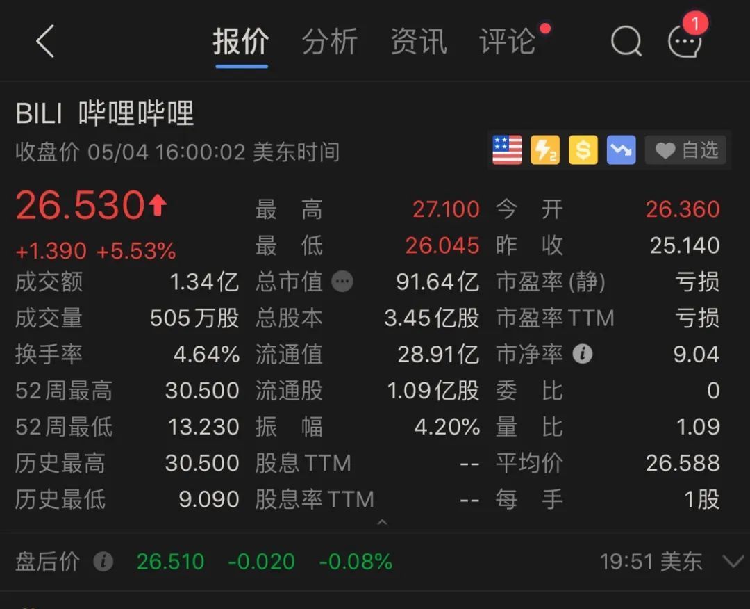 截止收盘,B站股价较前一个交易日上涨5.53%,市值达到91.64亿美元。也就是说, B站的市值就一天就暴涨了4.8亿美元,折合人民币约34亿元。