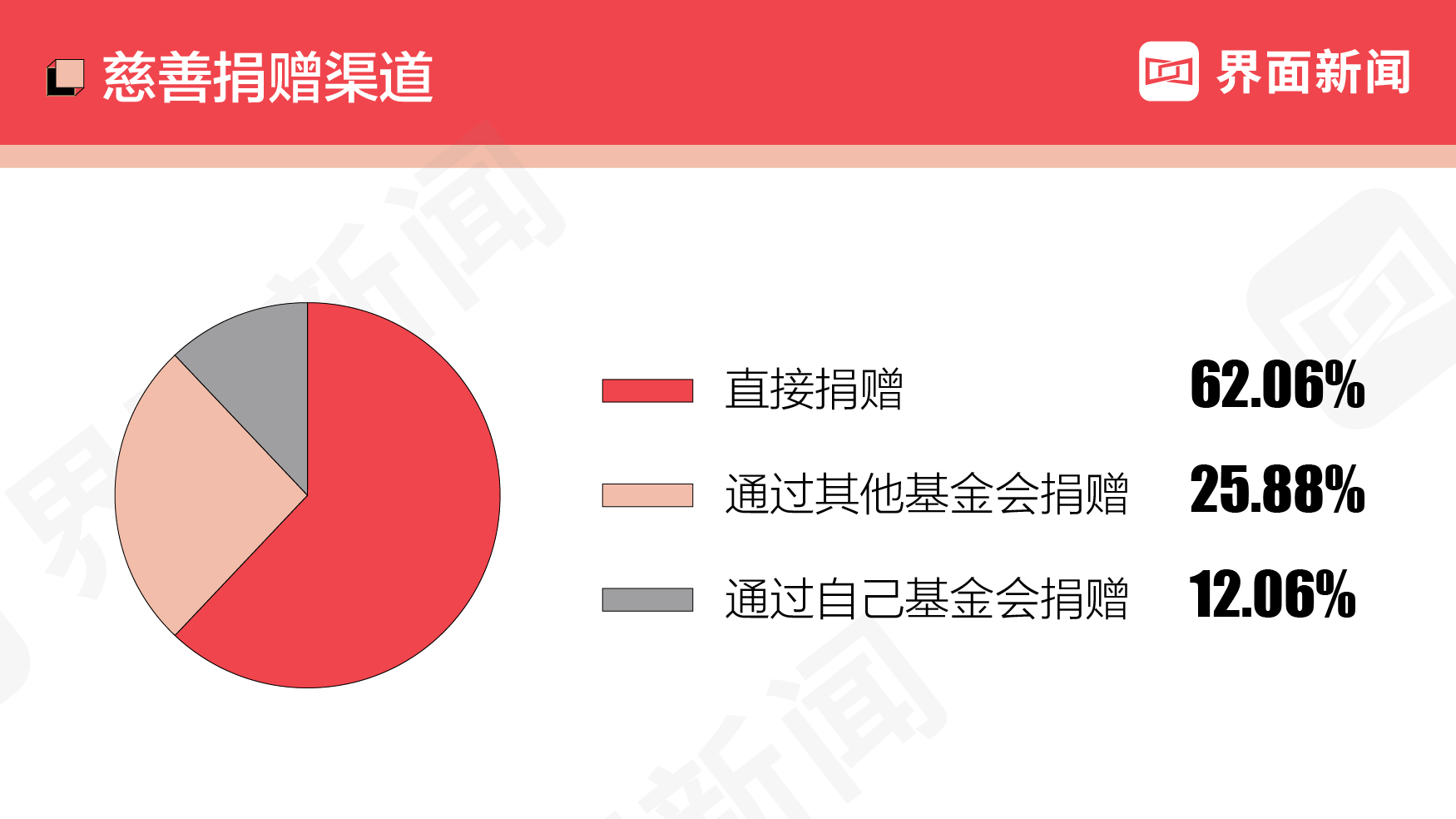 - 从捐赠渠道来看,今年的直接捐赠比例达到62.06%,基本与去年持平。
