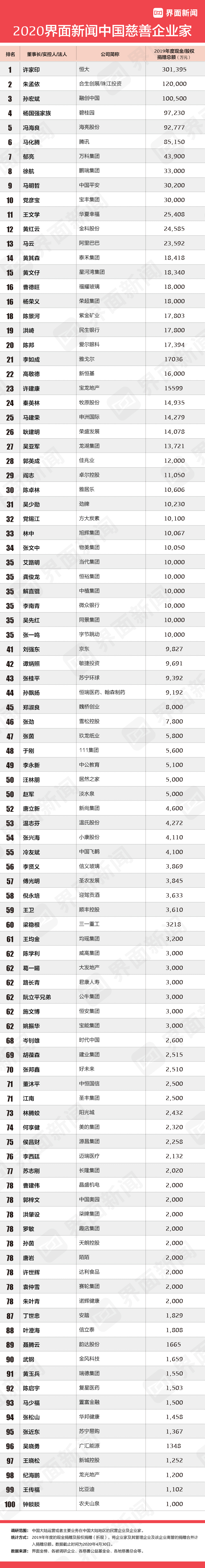 界面新闻发布2020中国慈善企业家榜。100位入榜企业家/企业的捐款总额高达157.49亿元,其中40位企业家/企业的捐款超过1亿元。今年的上榜门槛为1000万元。该榜单以在中国大陆运营或者主要业务在中国大陆地区的民营企业的企业家为主要考察对象,以企业家及其管理企业及该企业高管2019年年度的现金捐赠及股权捐赠(折现)为统计范围,进而编制本榜单。