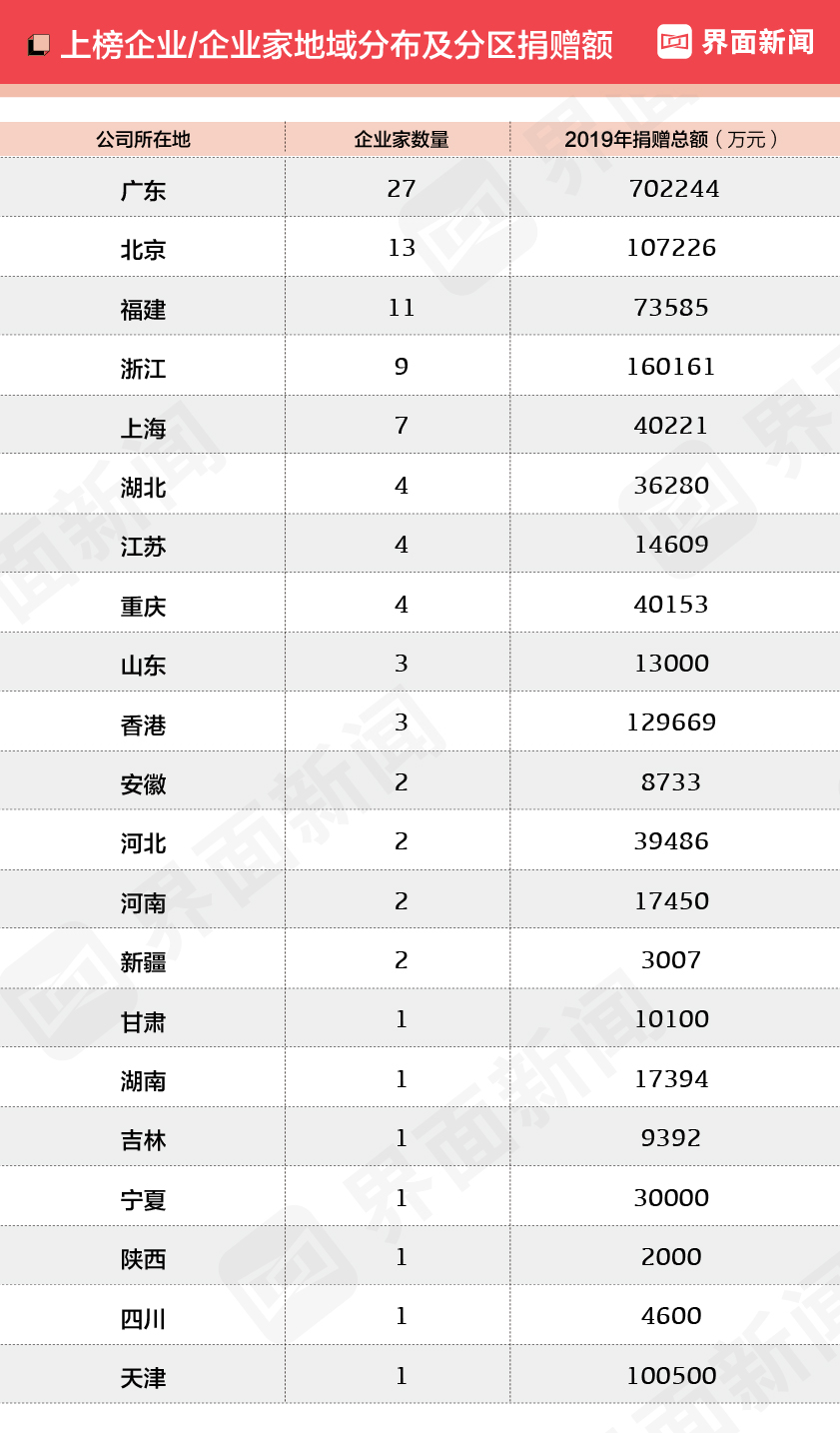 - 广东省再次以上榜企业家的数量和捐赠总额赢得双第一,共有27位入选,捐赠总额达到70.22亿元,占榜单捐赠总额的44.59%。
