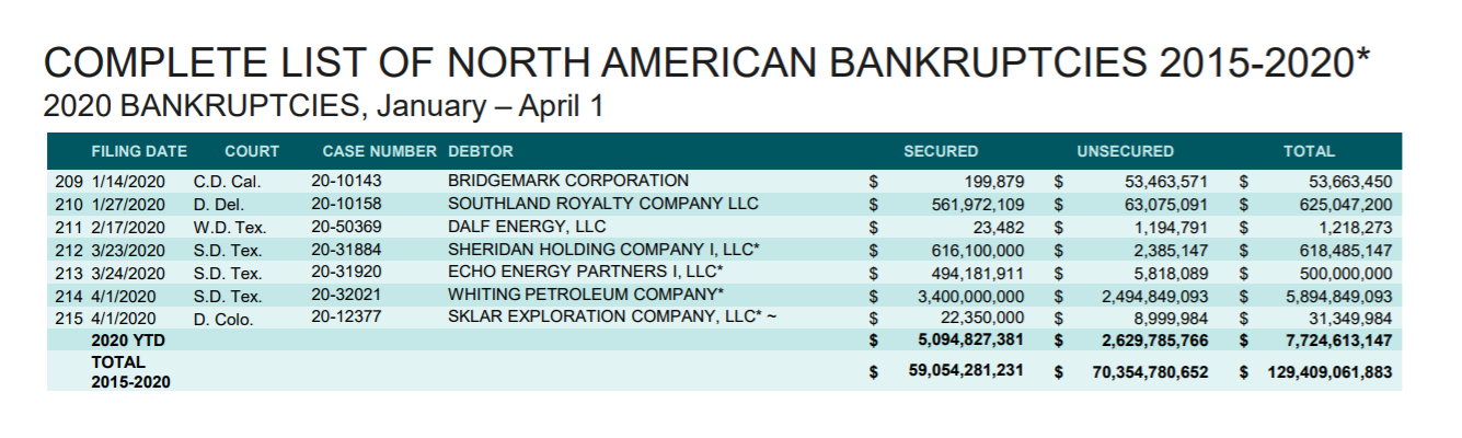 休斯敦律师事务所Haynes and Boone数据显示,今年1月至4月1日,北美地区已有七家油气生产商申请破产。