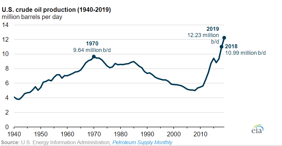 之后,沙特开启新一轮的原油减产,美国原油产量则在近三年内大幅增长。2019年,美国的原油产量达1230万桶/日,较2008年的500万桶/日增长超过一倍。