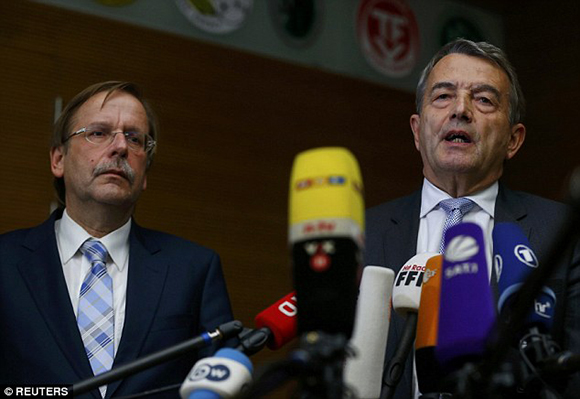 11月9日,尼尔斯巴赫(右)在位于法兰克福的德国足协总部向媒体发表了一份声明