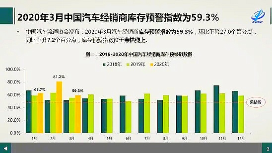 从2018下半年开始,全国经销商库存系数同比提高,库存压力越来越大。2019年12月,中国汽车流通协会发布数据显示,汽车经销商库存预警指数为59%,仍位于50%的警戒线以上。自2018年1月开始库存预警指数已经连续两年在荣枯线之上。