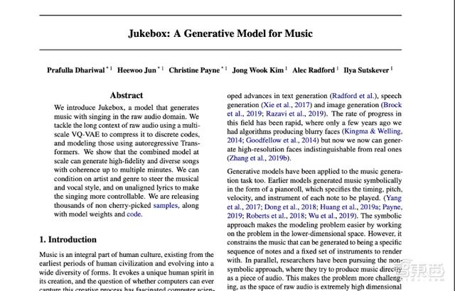 这项研究发表在OpenAI官网上,论文标题为《Jukebox:一个音乐生成模型(Jukebox: A Generative Model for Music)》