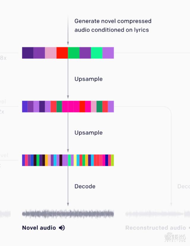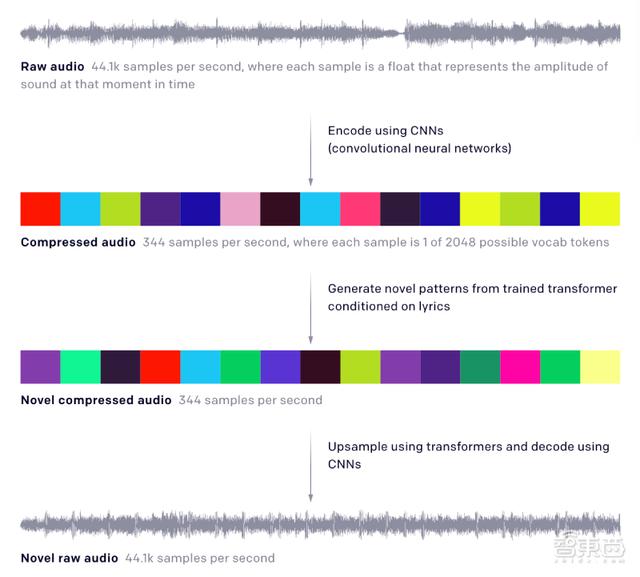 研究人员选用分层VQ-VAE模型(hierarchical VQ-VAE architecture)来压缩原始音频,再用一个自回归稀疏Transformer来预测音乐,同时训练一个自回归上采样算法来重现每个层次中丢失的信息。