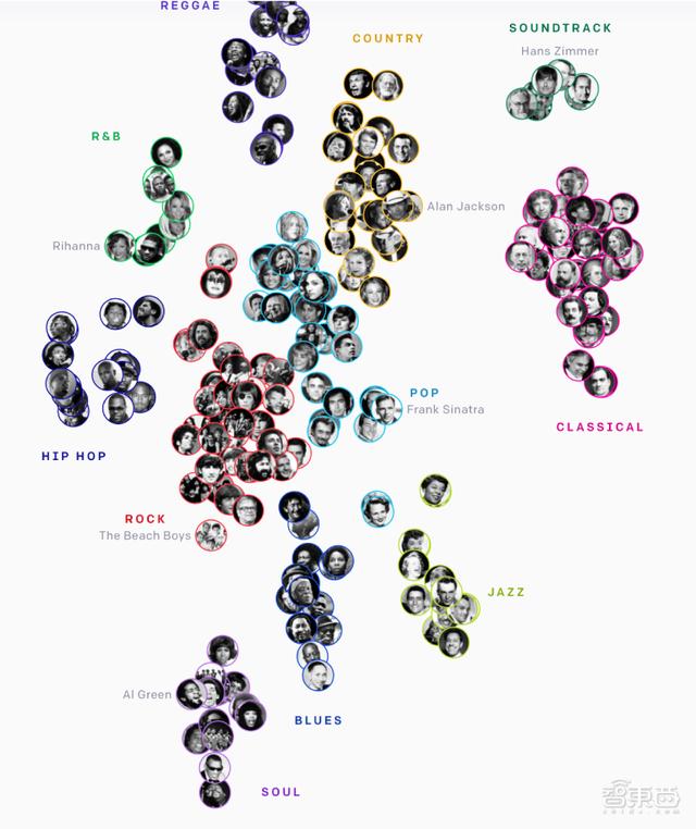 为了使生成的音乐效果更好,研究人员指定了生成歌曲的歌手和艺术风格。训练结果显示,模型可以在无监督方式下将风格相似的艺术家或流派分为一类。