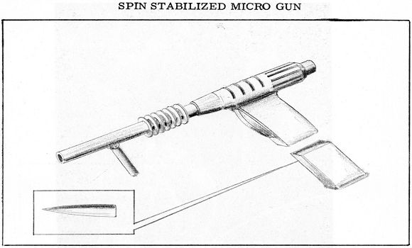 这把“自旋稳定微型枪”(Spin-Stabilized Micro Gun)会射出传统的装药发射式子弹。在真空环境中子弹速度可达每秒3000——4000英尺(约914——1219米),这个速度约比普通7.62毫米步枪每秒快1000英尺(约305米)。