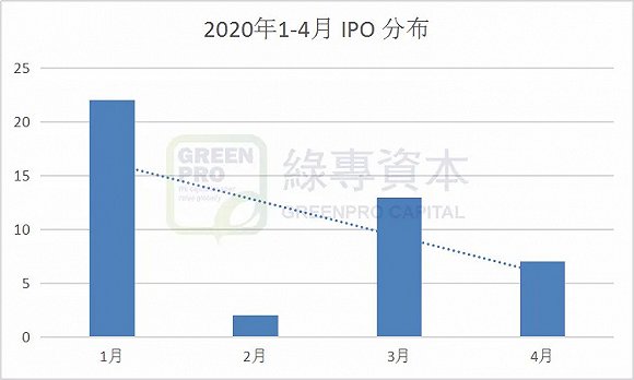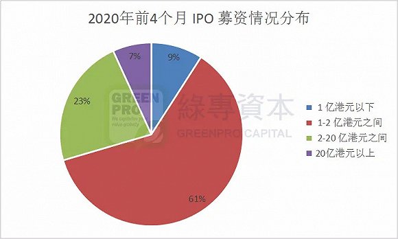 虽然在IPO数量上,今年前4个月比2019年同期略高出了 1 家,但募资金额却大幅缩减。44 家IPO 上市公司一共募资 178 亿港元,比2019年同期的募资减少 45.74%。