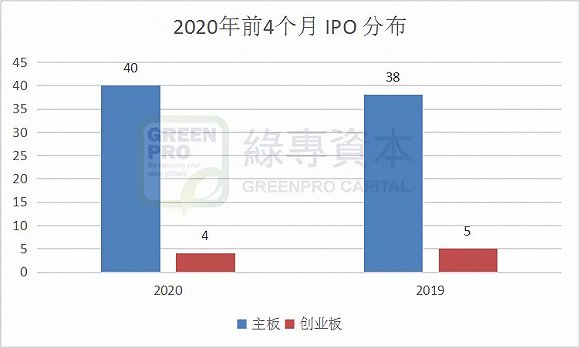 今年前4个月,在主板上市的新公司为40家,超过2019年同期;创业板新上市公司为 4 家,略低于去年同期,2019年同期创业板 IPO 为5家。