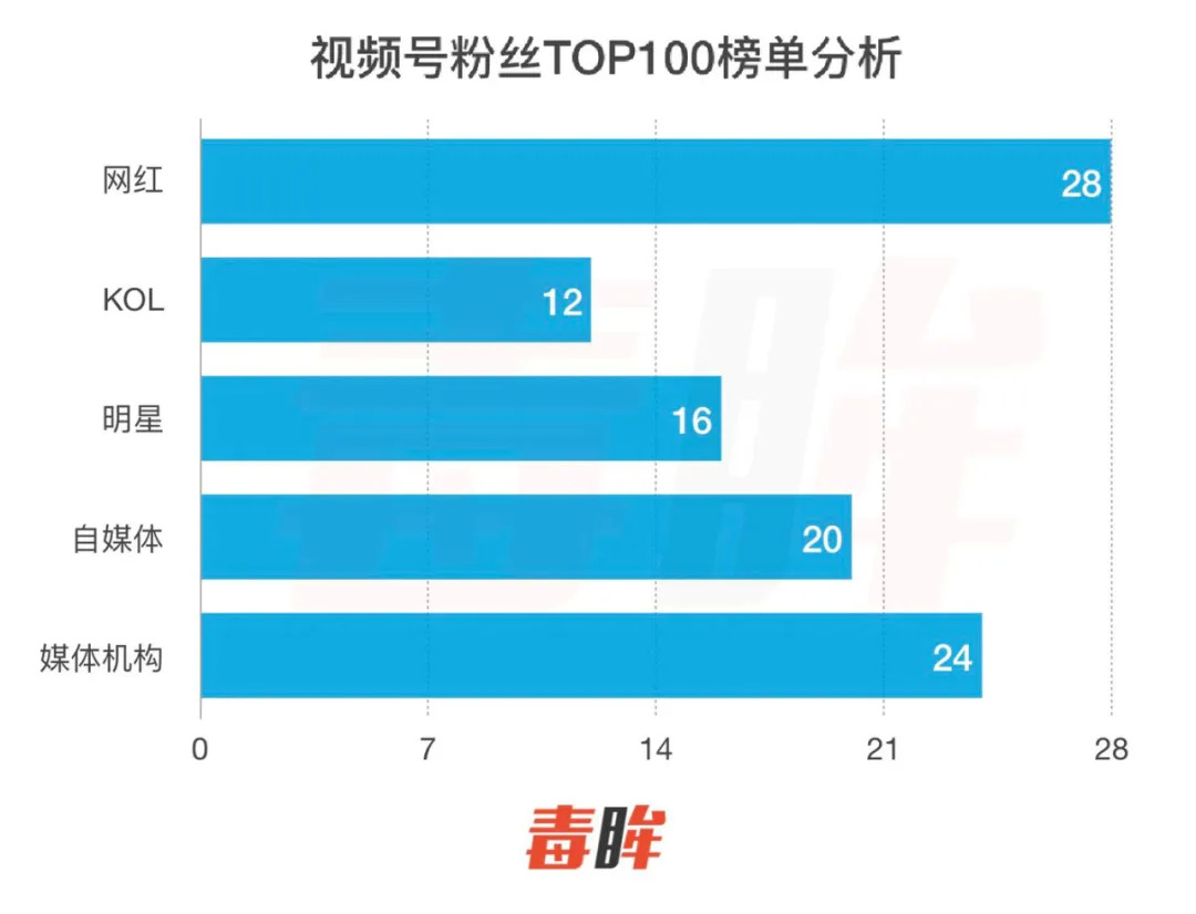 也是在这个时候,号称新媒体的“风向标”的新榜推出了“视频号粉丝Top100榜单”。虽然很快删除,但当中包含的信息依然值得参考。毒眸梳理发现,当前上榜的创作者有5类:头部以网红和媒体机构为主,腰部以自媒体和明星为主,尾部多是KOL,还混杂着不少其他类型创作者。其中,网红28席、KOL12席、明星16席、自媒体20席和媒体机构24席。