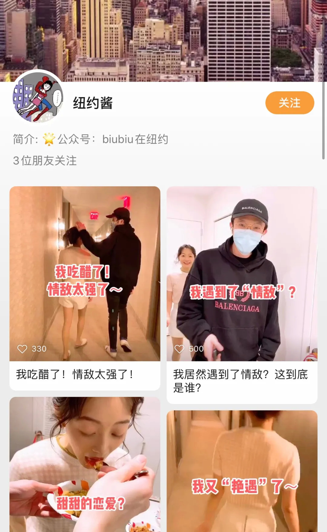 通过大量的学习、研究,Biubiu很快参透了短视频的玩法,她为旗下视频号“纽约酱”设计了一个在纽约的东北口音的直男的形象,通过短剧的形式,讲述留学生的恋爱和生活。短短两个月,“纽约酱”的抖音粉丝就积累了37万,而同时期开通的同名视频号,也登上了新榜视频号Top100的榜单。