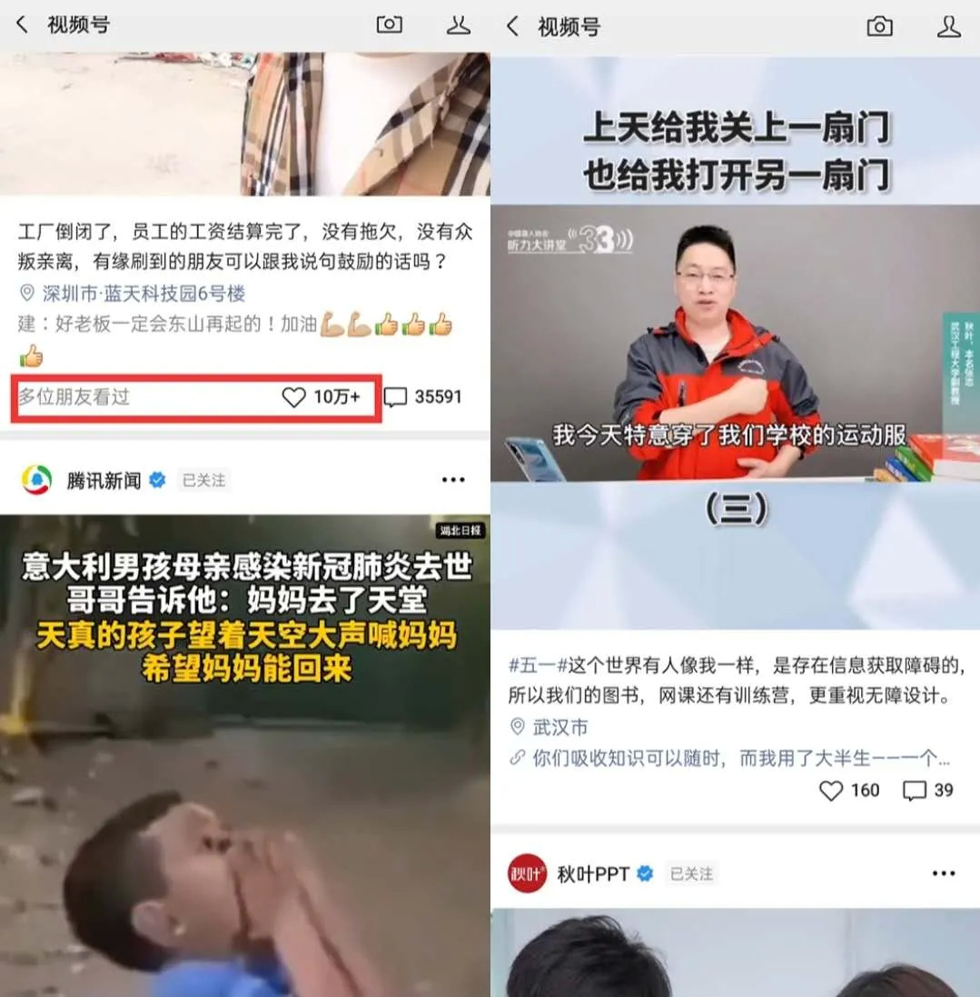 秋叶大叔本人也运营着两个视频号,分别是“秋叶大叔”和“秋叶PPT”,他调查发现,好多没有关注自己视频号的人,都在信息流中收到了自己的短视频推送,但这些人多多少少都与他本人有点关系,“有我公众号的粉丝、微信好友、微信群友……甚至是朋友圈里朋友的朋友。”