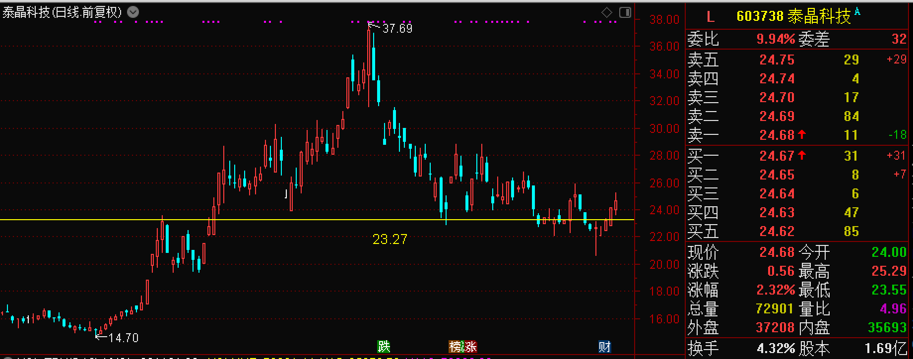 而从盘面上看,泰晶科技票2020年3月30日至2020年5月6日期间,连续三十个交易日中至少有十五个交易日收盘价格不低于“泰晶转债”当期转股价格的130%(即23.27元/股),已触发“泰晶转债”的赎回条款。
