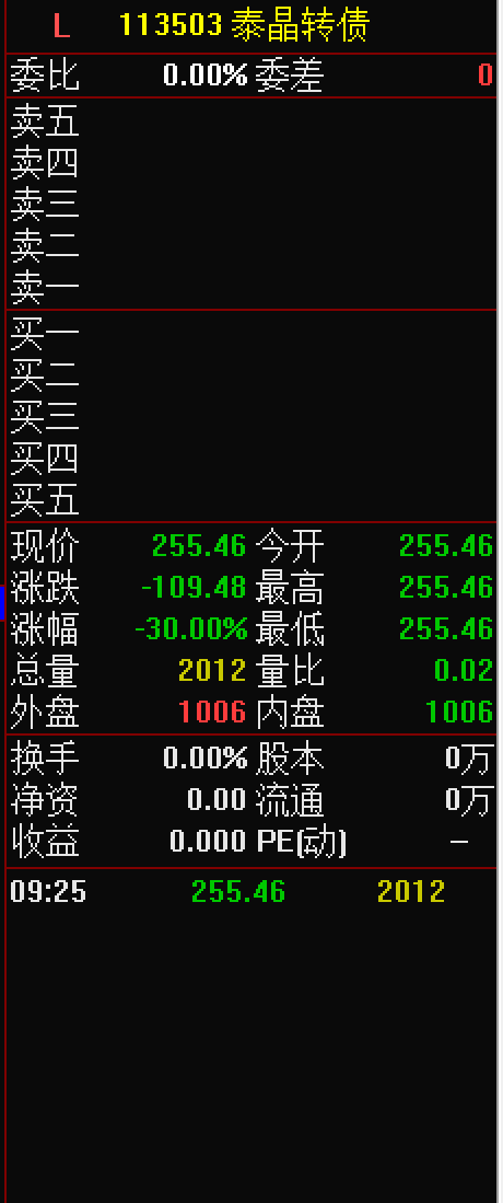 通达信数据显示,截至4月15日,泰晶转债的规模为3152.69万元,盘子已非常小。受到消息刺激,5月7日,泰晶转债在早晨9点25分,以255.46元的价格完成一笔交易,交易价较上一个交易日末跌幅高达30%,较前收盘价大跌109.48元。