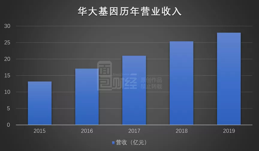 从最近五年的财务数据来看,华大基因的营业收入从2015年13.19亿元上升至2019年28亿元,年均复合增速达到20.71%。