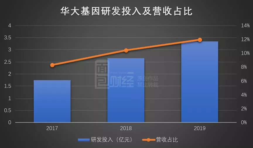 华大基因2019年的研发投入达到3.34亿元,占同期营业收入的比例为11.94%。对比2017年和2018年,华大基因研发投入金额和营收占比均呈上升趋势。