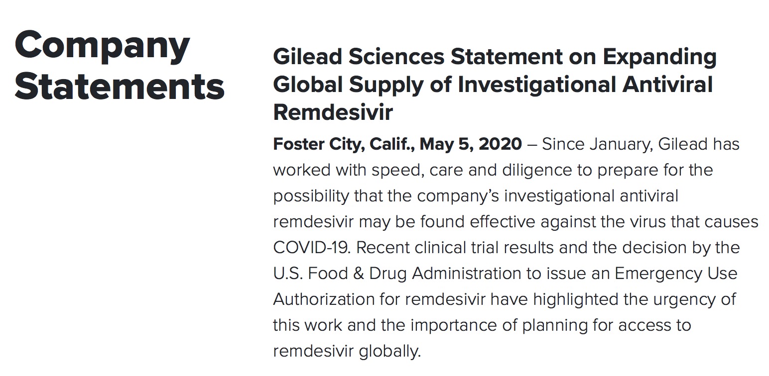 5月5日,吉利德公司发表声明表示,鉴于近期瑞德西韦的临床试验结果及FDA的紧急使用授权,使得全球范围内瑞德西韦的可及性成为一项紧急的任务,公司正与其他制药公司一道在美国以外的地区生产及销售瑞德西韦,确保药品供应能够满足全球需求。