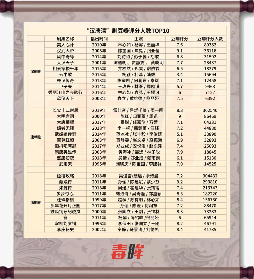 从各类朝代剧豆瓣评分人数TOP10来看,A班的朝代剧汉、唐、清,是唯三入榜评分人数不低于6000,且在正剧、“戏说”剧、“IP流量”剧都齐全了的朝代剧,可谓是准确踩在了电视剧行业重要的发展节点,是当之无愧的“顶流”。