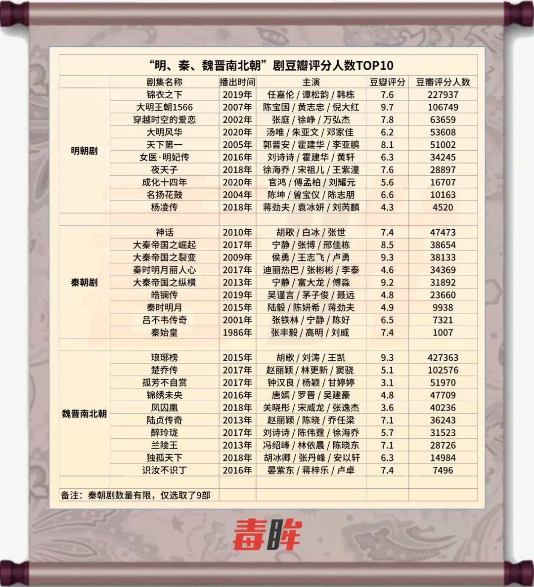 有相关从业者告诉毒眸,与汉、唐、清相比,秦朝相关的史料并不多,这也给影视化带来了难度。但秦朝剧仍然有高质量的正剧压身,比如榜单里的《秦始皇》和占据三席的“大秦帝国”系列。