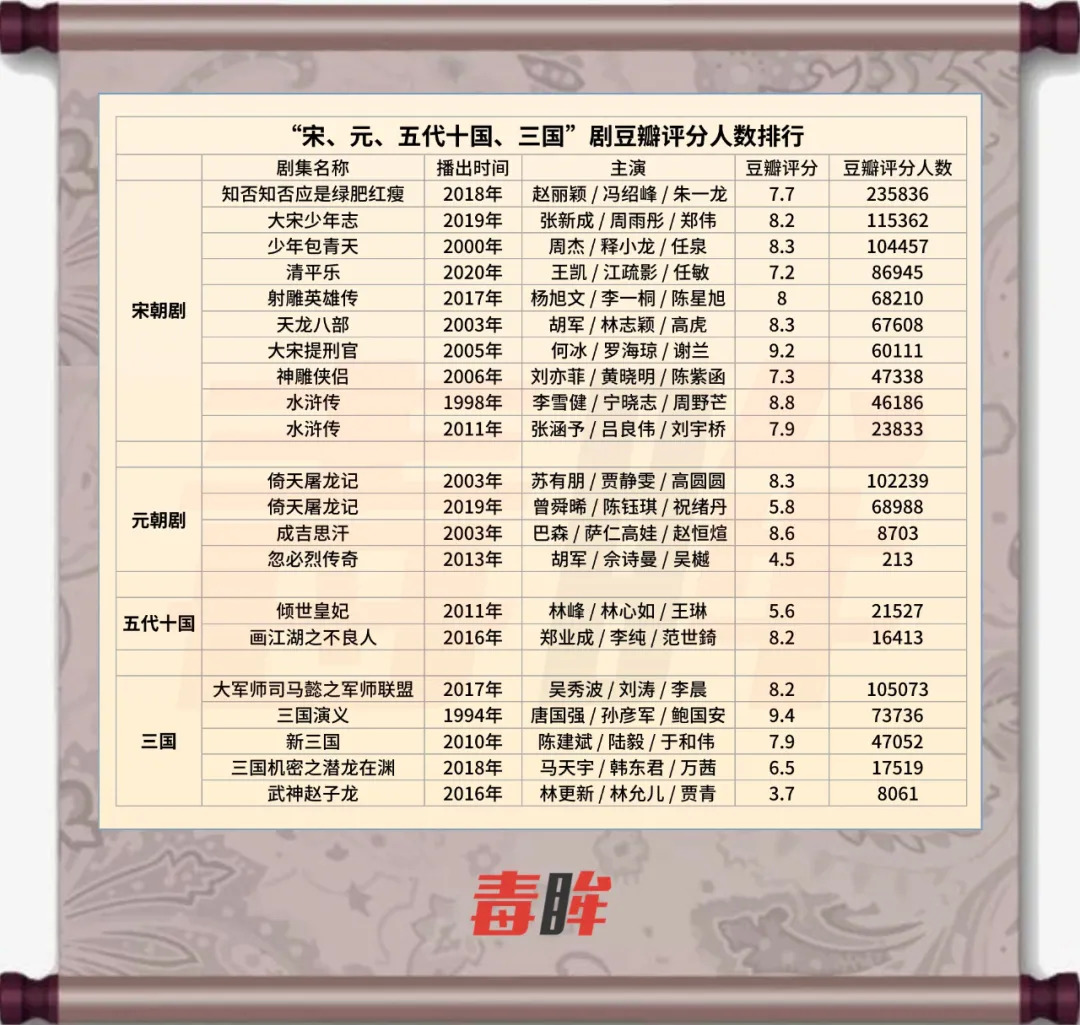 并不被国剧重点书写的宋朝,应该为《清平乐》的争议买单吗?这个朝代的“糊”为《清平乐》制造了观看门槛吗?毒眸追溯了过往的古装剧后发现,在“朝代剧101”的战局中,如果从朝代剧的豆瓣评分人数排行TOP10的剧里,按照口碑及影响程度来排列,这些朝代剧大体能分为三个梯队,宋朝剧确实只能排到“C班”。