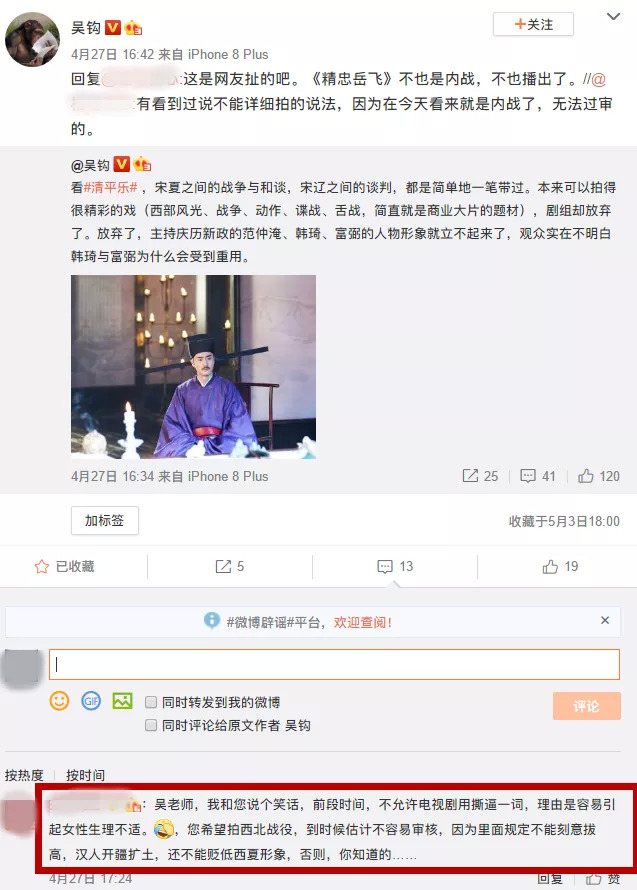 此外,不拍帝王故事还有一个原因:涉及到多民族的战争问题,不好处理。吴钩曾发微博表示宋夏之间的战争是“本来可以拍得很精彩的戏”,不过下方有知情人士做出了解答——
