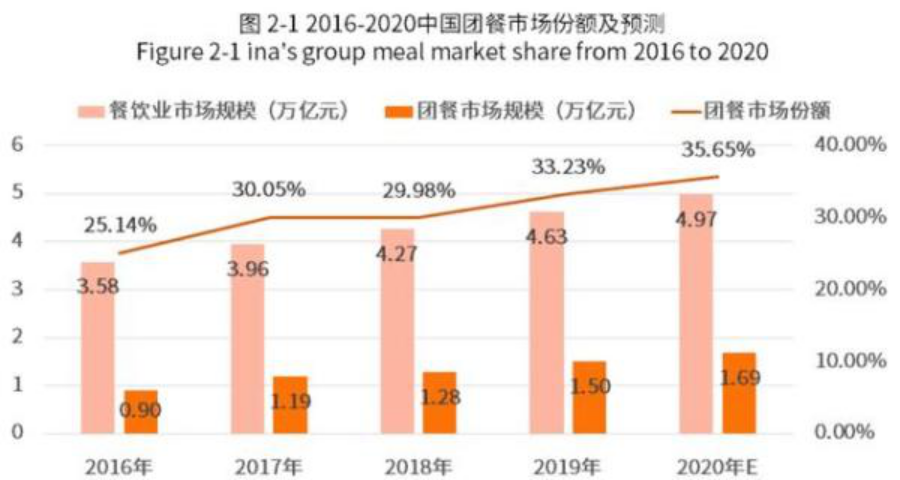 据iiMedia Research(艾媒咨询)统计,2019年中国团餐市场规模高达1.5万亿元,占整个中国餐饮市场的33.23%。预计2020年中国团餐市场规模将增长12.67%,届时中国团餐市场总规模将达到1.69万亿元,餐饮市场的占比将提升到35.65%。粗略估算,团餐的体量大约为在线外卖的6倍。