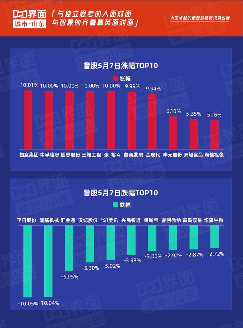 受大盘影响,5月7日,山东省内沪深股票有77只个股上涨,127只下跌,8只与上一个交易日收盘价持平;如意集团全省涨幅最大,达10.01%。