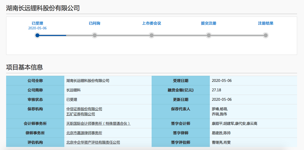 5月6日,根据长远锂科披露的首次公开发行股票招股说明书(申报稿),中信证券、五矿证券为其联合保荐机构,拟募资不超过27.18亿元,将用于车用锂电池正极材料扩产一期项目及补充营运资金。