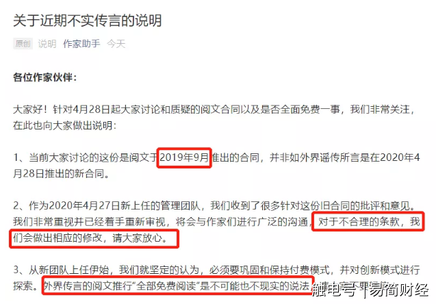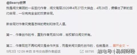 于是,5月3日凌晨,阅文集团紧急回应称,这份合同是阅文于2019年9月推出的,并非如外界所言是在2020年4月28日推出的新合同。新上任的管理团队将会与作家们进行沟通,对于不合理的条款,阅文会做出相应的修改。