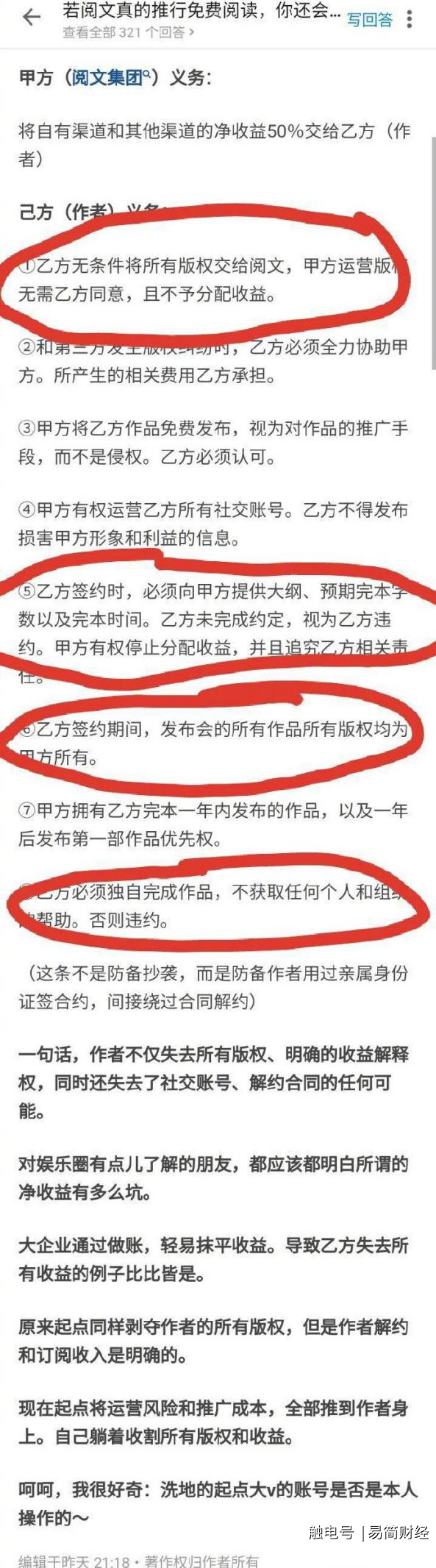 有网友总结阅文写作合同条款的“霸道”之处: